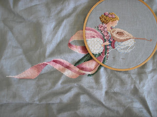 And now to something completely different. This is my "eternal" project, as I like to call it. Ever since I studied in England for a year, I am hooked on cross stitch. I have done tons of projects but I have been working on this for 12 years now. There have been long breaks, of course, and I guess it will take me some more years to finish them. The designs are from Lavender and Lace and they are four angels, one for each season. I started with "The Angel of Summer":